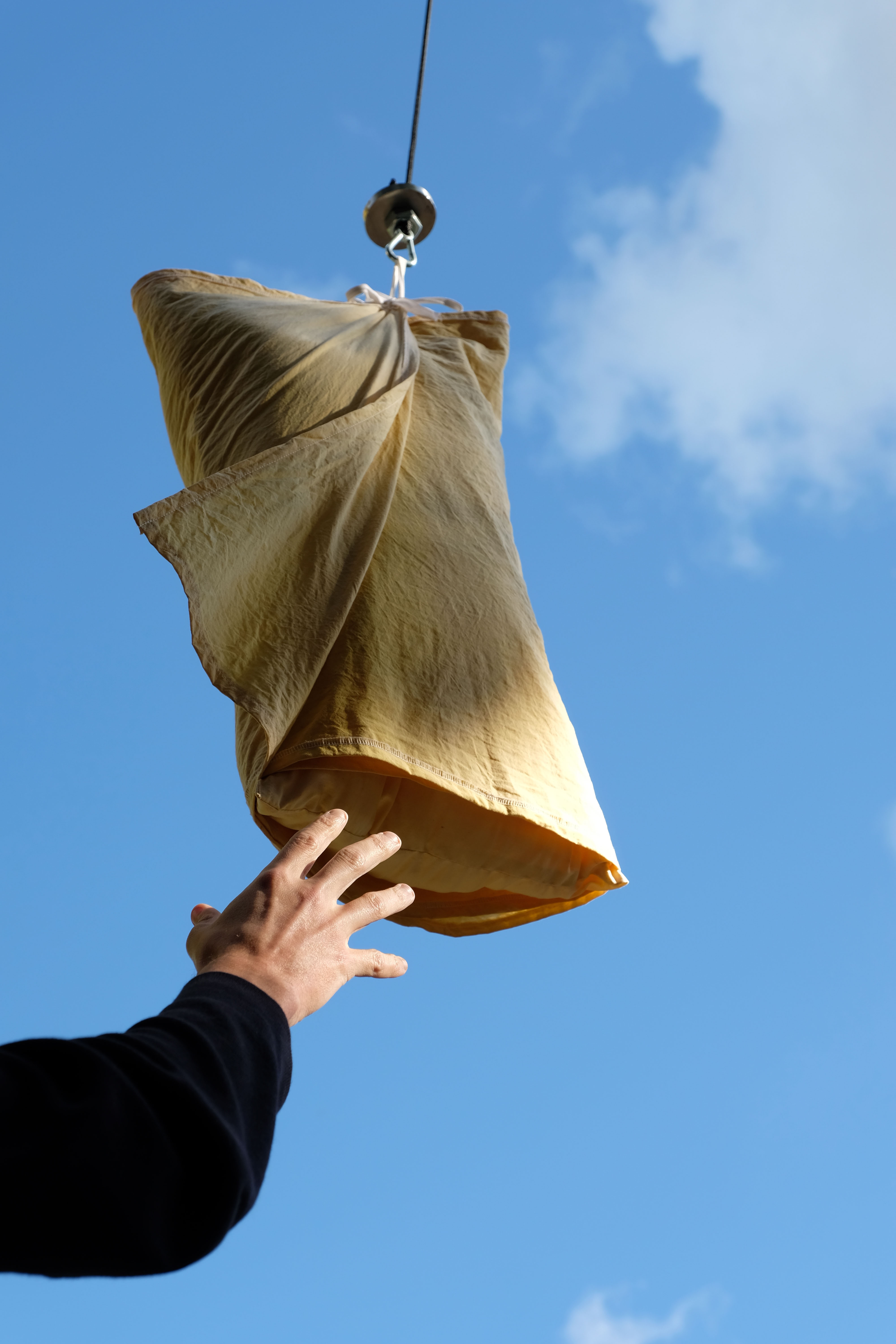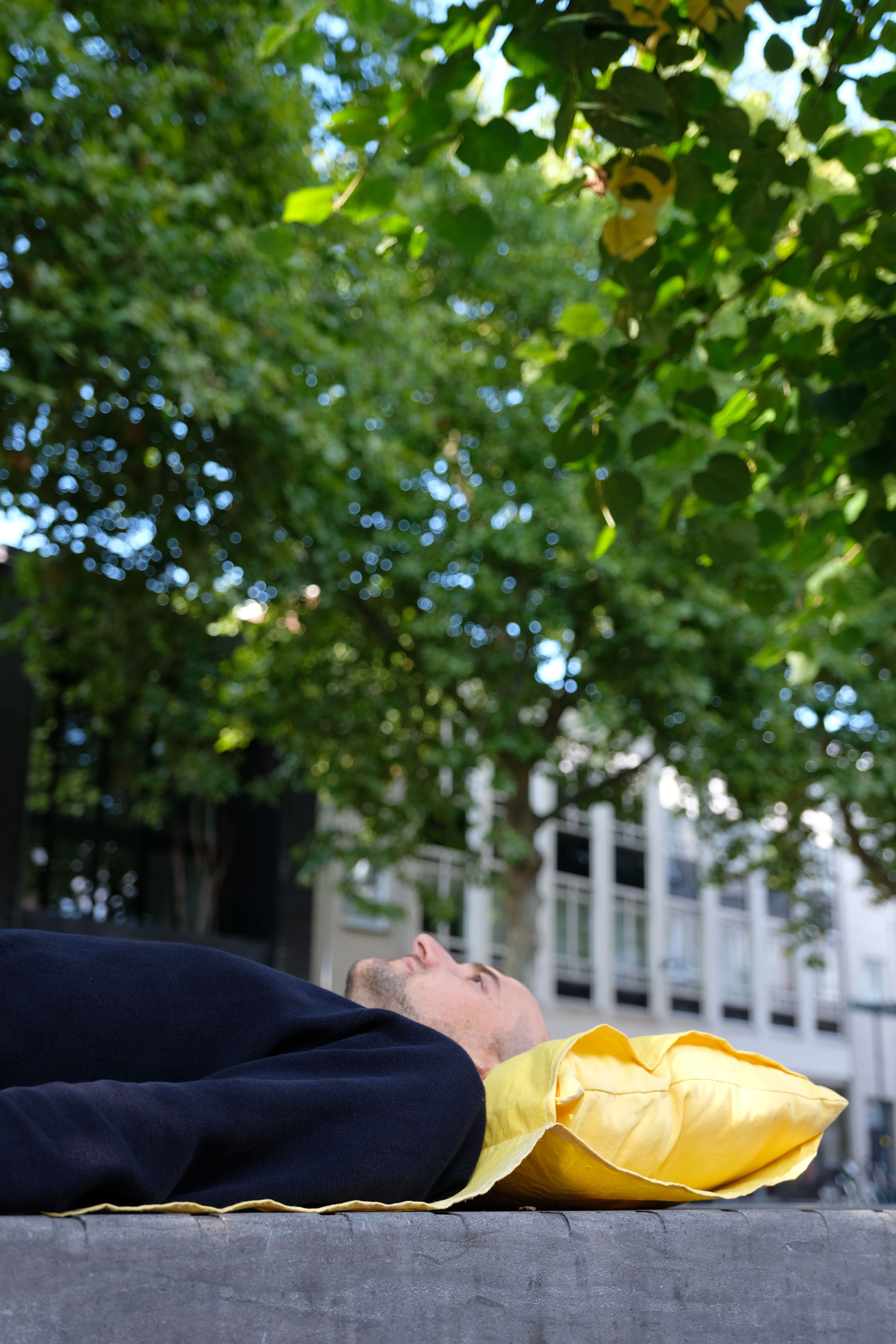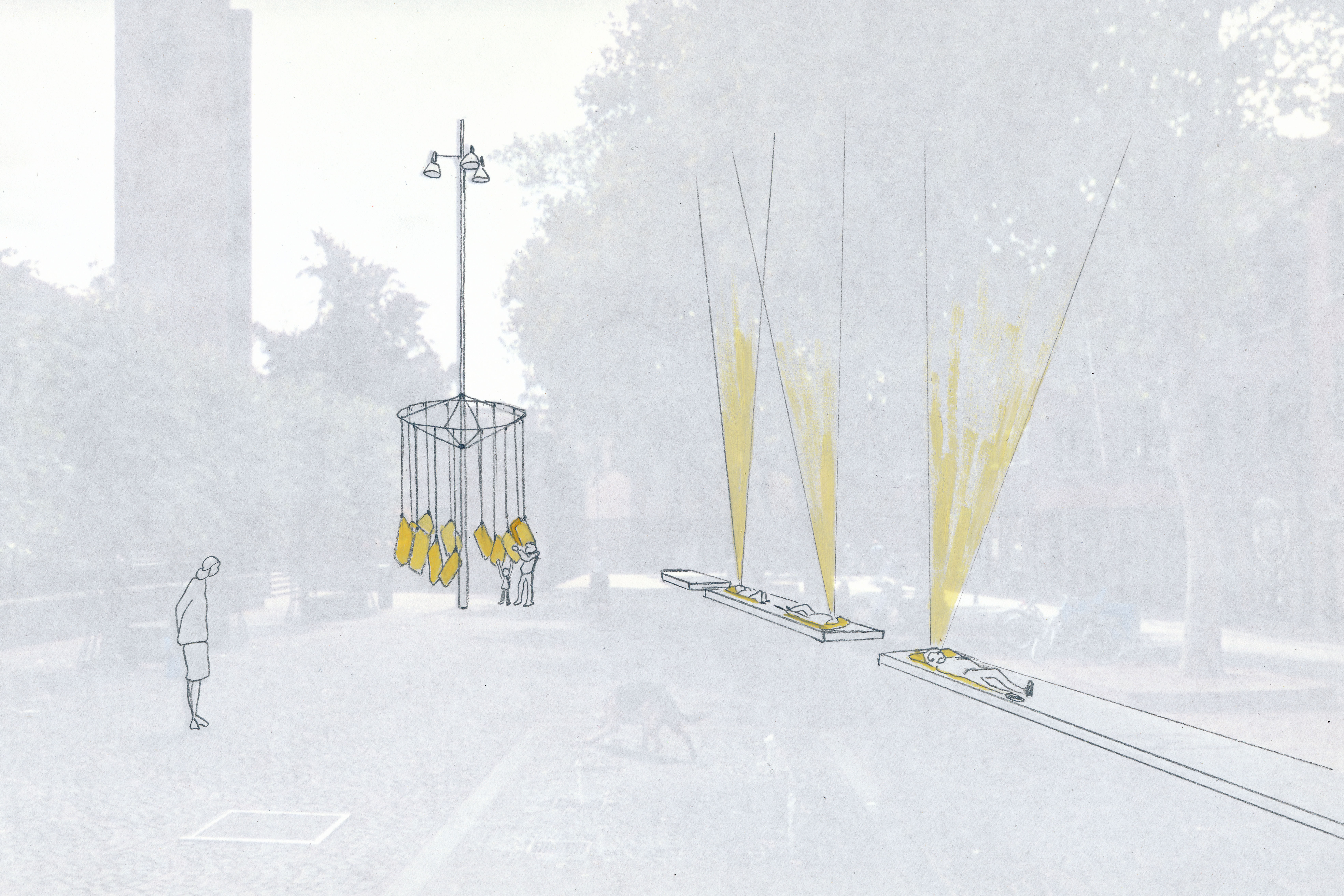 There are five old plane trees on Dominican Square, which are the subject of the intervention. A ring has been designed around a lamppost, from which homemade cushions and rugs hang. The cushions and rugs can be used to lie on and look up at the treetops.