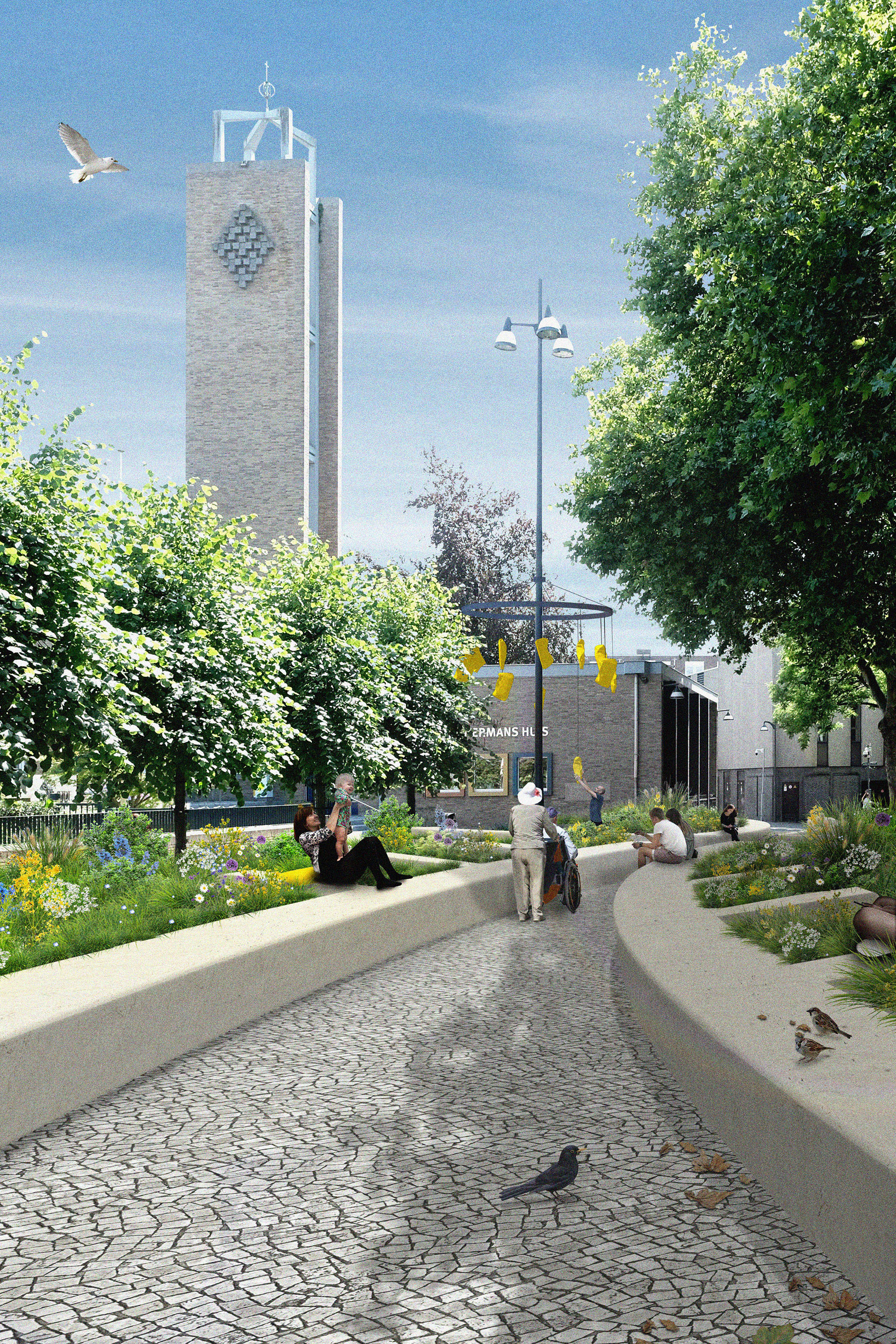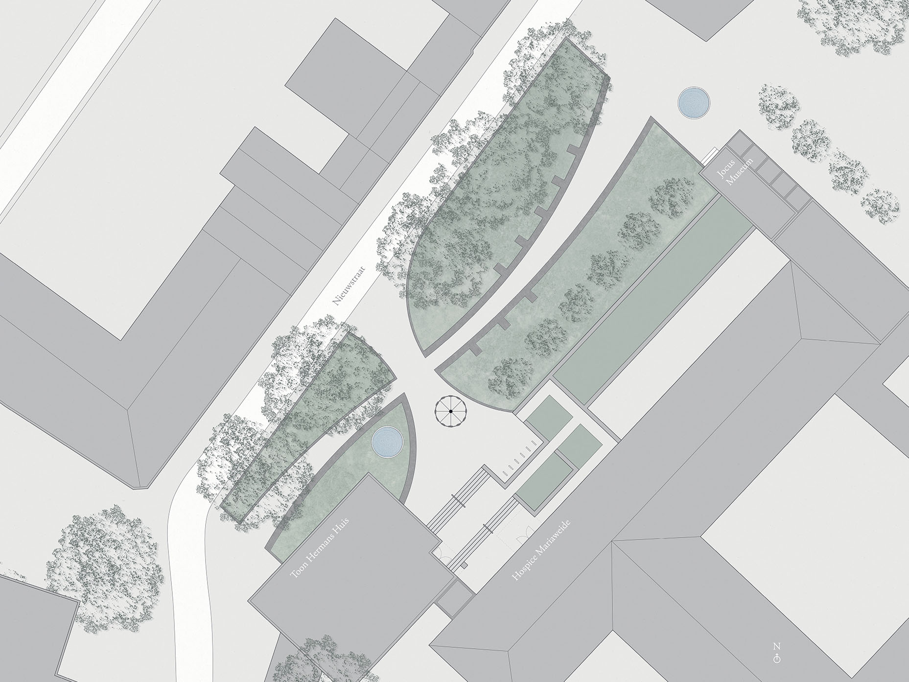 The project is located on Dominicanenplein in Venlo, a heavily paved square in the city centre. The square is surrounded by shops and homes, as well as a hospice and a drop-in centre for people affected by cancer. Today, the square is mainly used as a thoroughfare to nearby streets, but in the past it was a flower garden belonging to the Mariaweide monastery. Historical drawings show the Dominican monastery and extensive green areas within the walls of the old city ramparts.