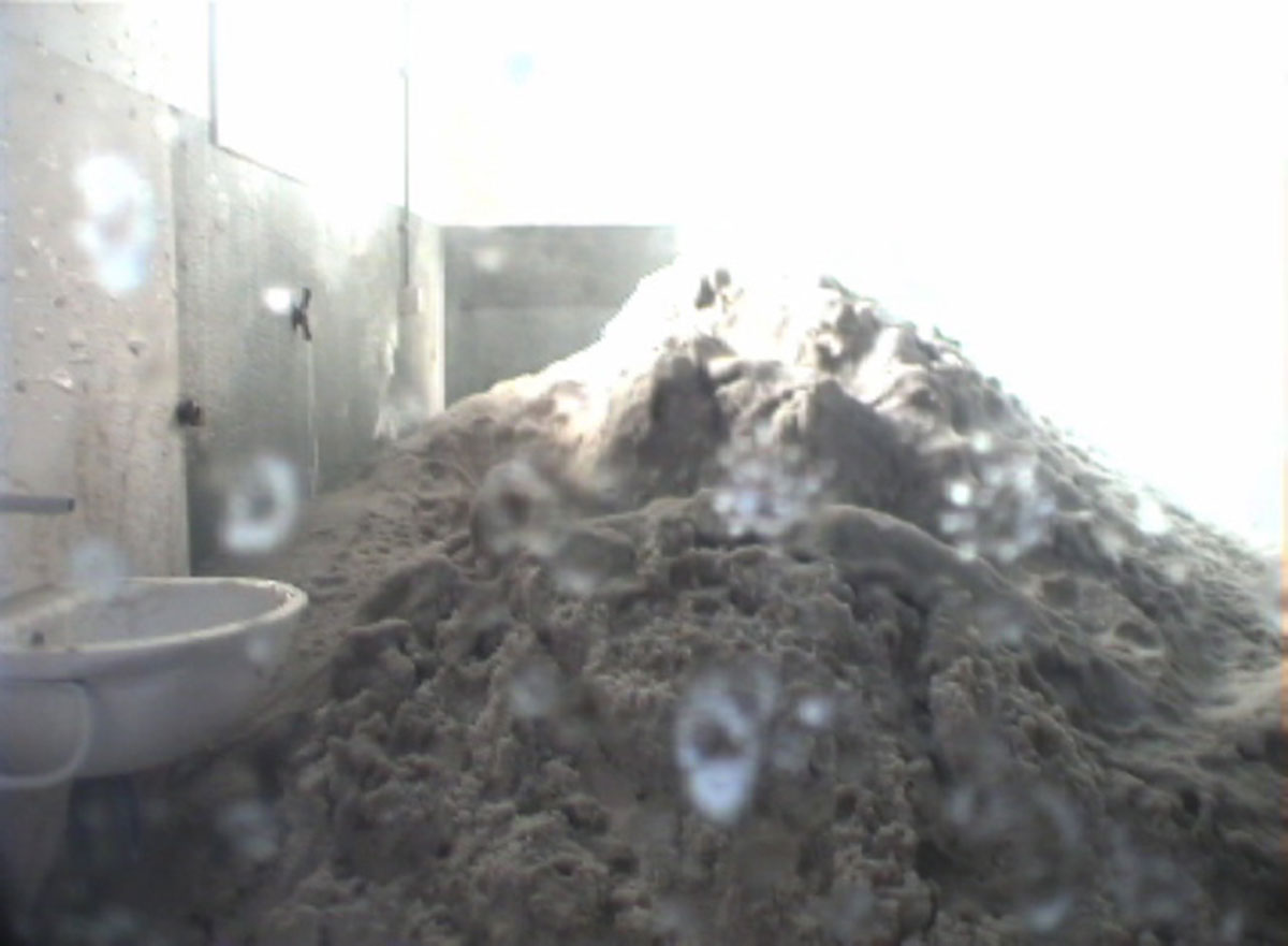 The piece is based on an existing storage room for ammunition found at the barracks. Images filmed in the actual storage room and films made within a model of the space combine to create a dream-like reality. The flow of time measured by the sand is reversed.