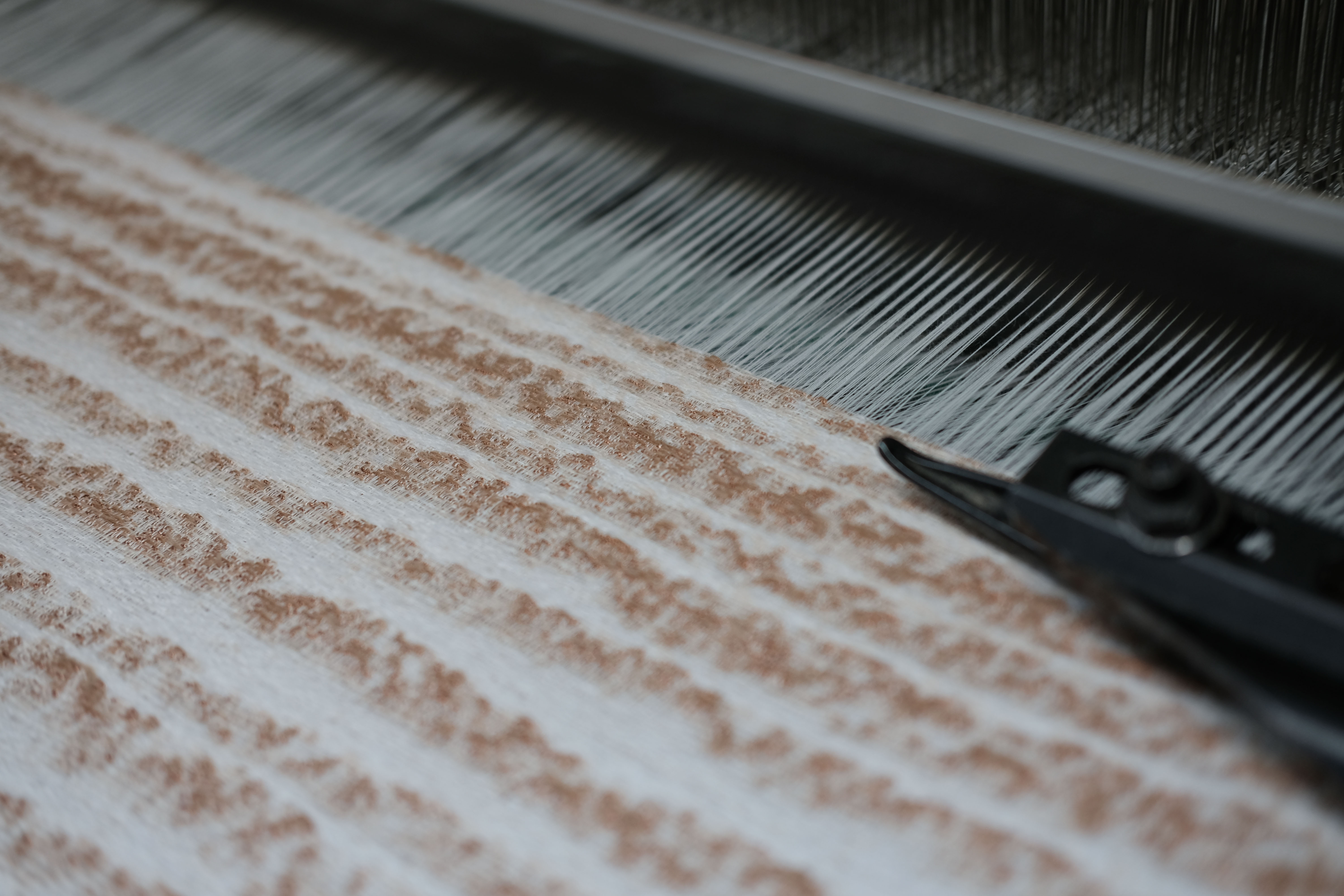In the choice of threads, the same subtle tension is present between the technological – in the lustrous viscose and lurex threads – and the biological – in the matte sheep’s wool and goat’s wool yarn. The design intent is a textile in which system and chance reinforce one another, like the way wood grain reflects the uncontrolled yet repetitive growth pattern of a tree.