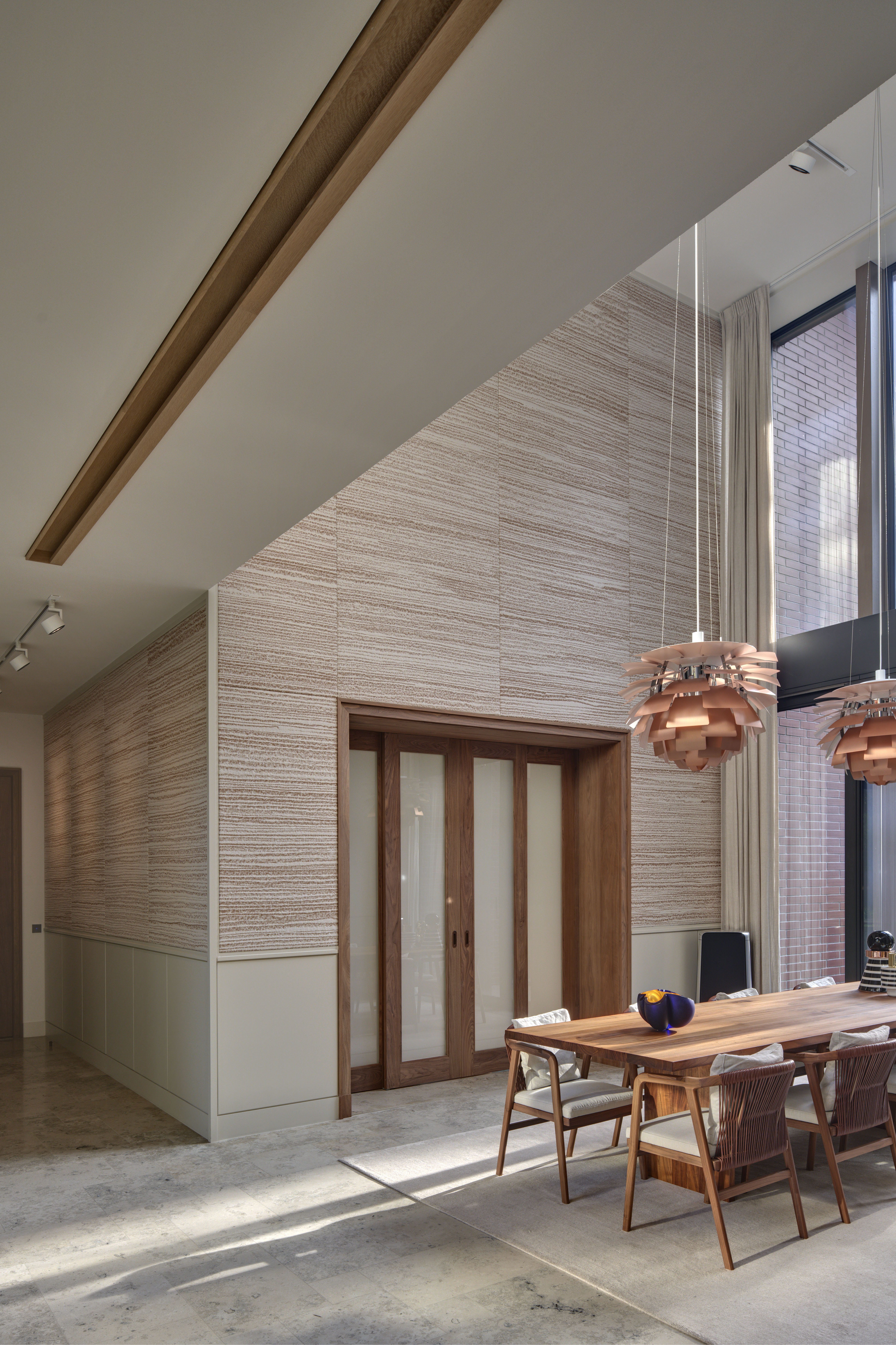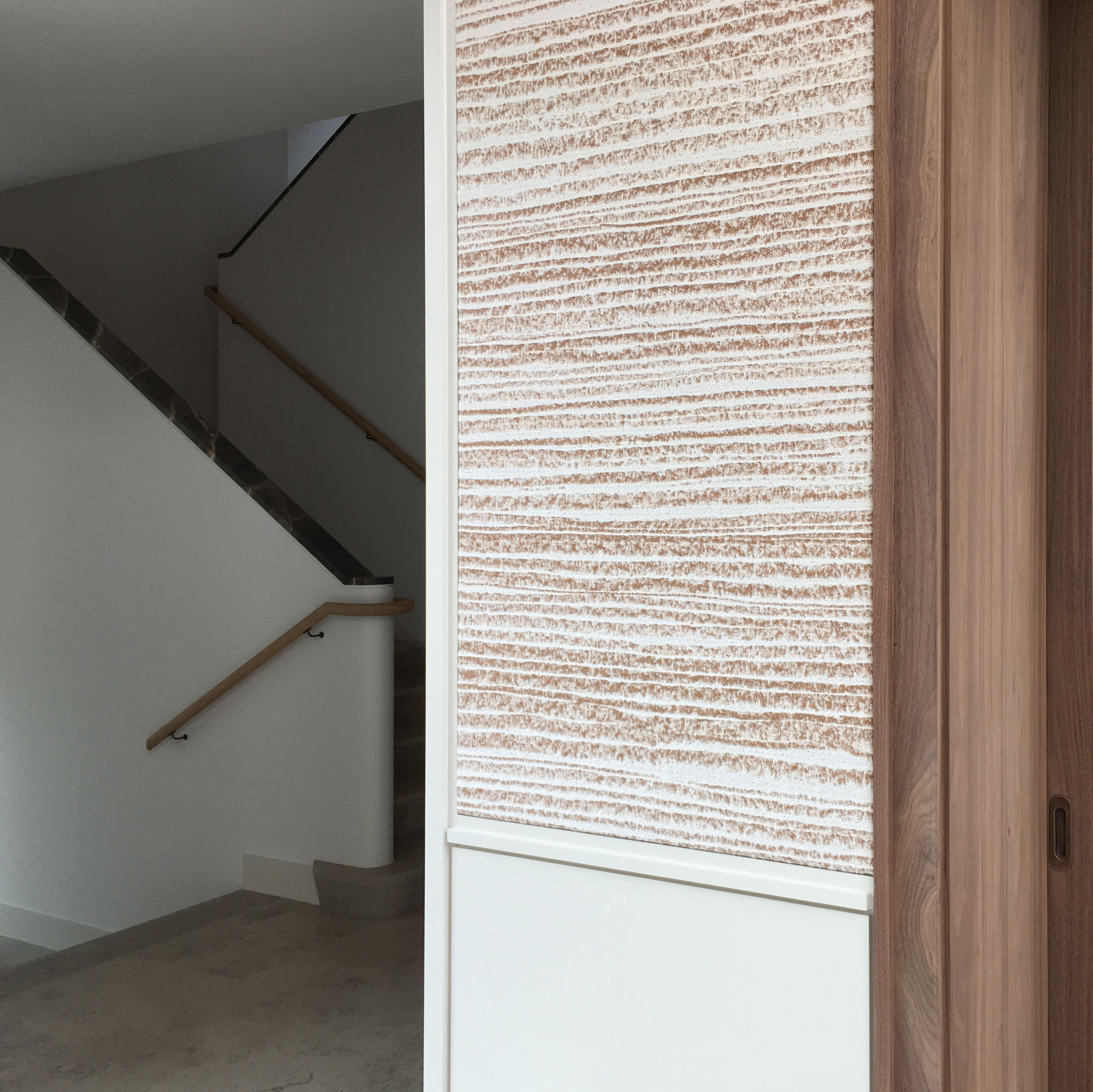 Fourteen woven panels clothe two walls in the villa’s hall, which looks out on a heritage tree, an imposing specimen from the former arboretum. The pattern woven into the textile is based on the tree motif, but in the sense of an abstracted design, not a realistic rendering.