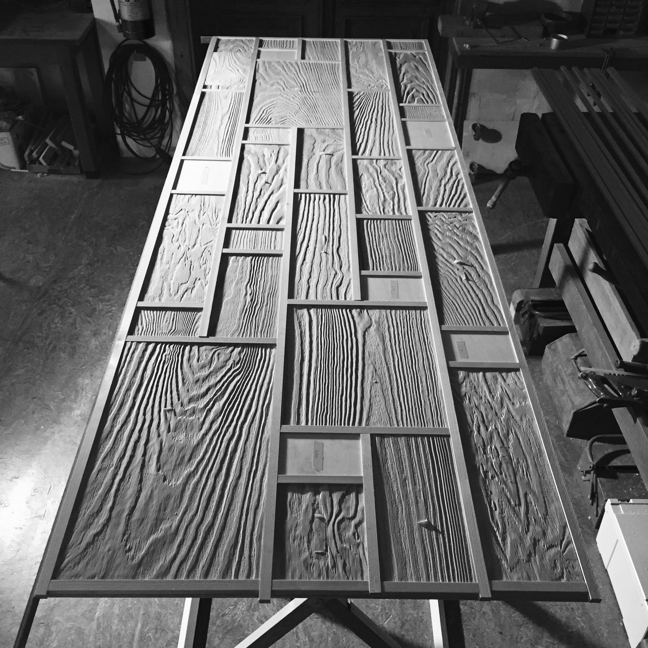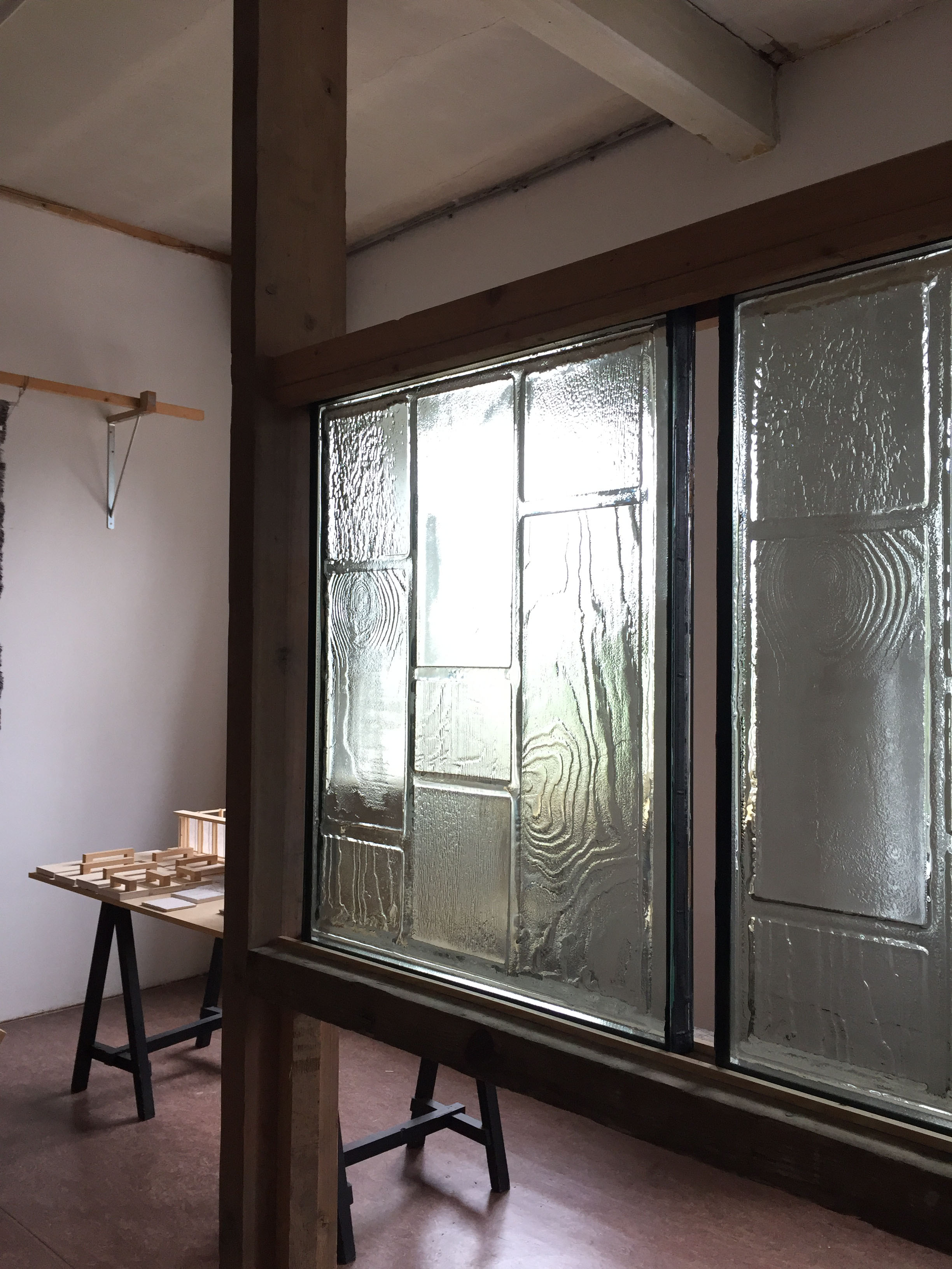 Each window is made up of different relief elements. Framed by a strong line in a suggestion of panes, the composition of these elements is based on four fixed proportions and the particular window’s dimensions. The glass reliefs are impressions of select samples of wood grain, transformed into glass during the production process. Each imprint shows a unique growth signature – the fingerprint of a tree.