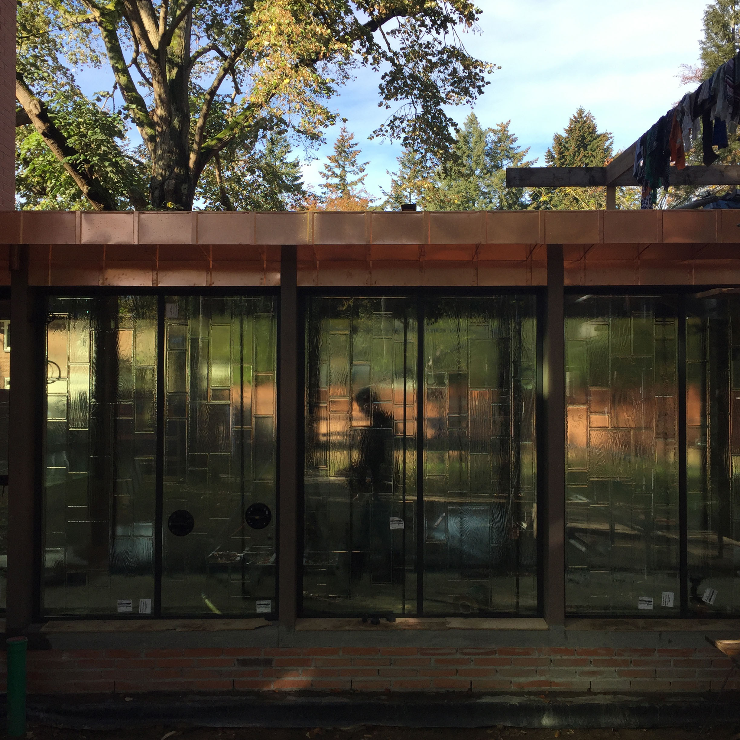In spaces one moves through, like the hallway, the vertical lines in the glass are emphasized; in living spaces, the horizontal. The panes total 23 m2 of clear textured glass, divided over 32 windows.