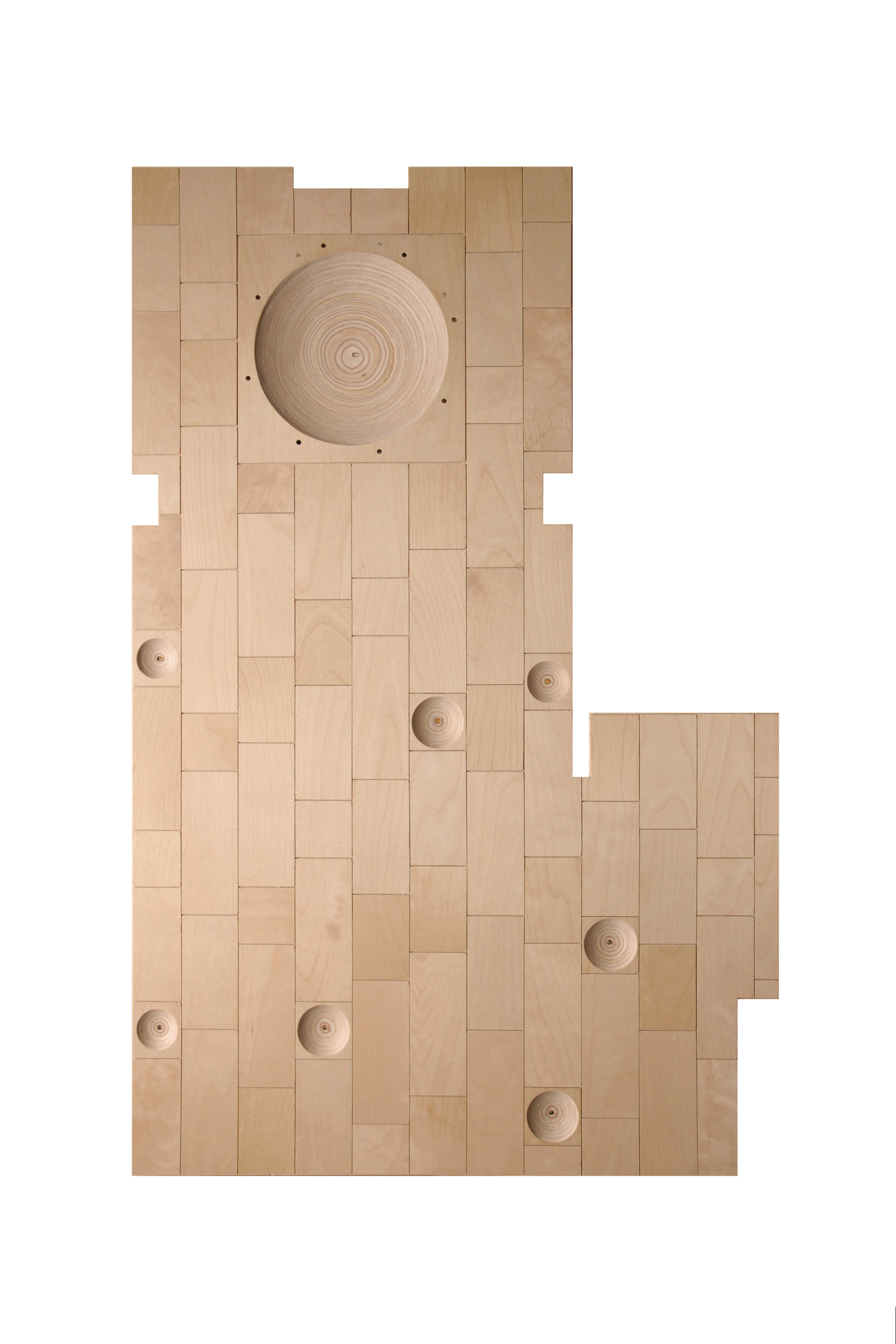 The ceiling and floor design is inspired by the saying, 'On earth as it is in heaven.' This particular place in Delfshaven is a sacred place. After all, residents can no longer travel elsewhere. They find themselves here, between heaven (ceiling) and earth (floor), standing, sitting in wheelchairs, or lying in hospital beds. I replaced the standard ceiling with a wooden relief ceiling, so that the visitors in beds also have a nice view. In both the ceiling and floor, the circle was chosen as the primary motif, alluding to the dome, the mandala, celestial bodies, and the compass rose. Recessed light fixtures in the ceiling together form a constellation. The wooden floor is inlaid with a compass rose which indicates magnetic North and the position of Mecca. The latter, called 'qibla', lets Muslims know which direction they should face while praying. The liturgical center of the space is where the largest recess in the ceiling (heaven) is reflected by the compass rose in the floor (earth)."